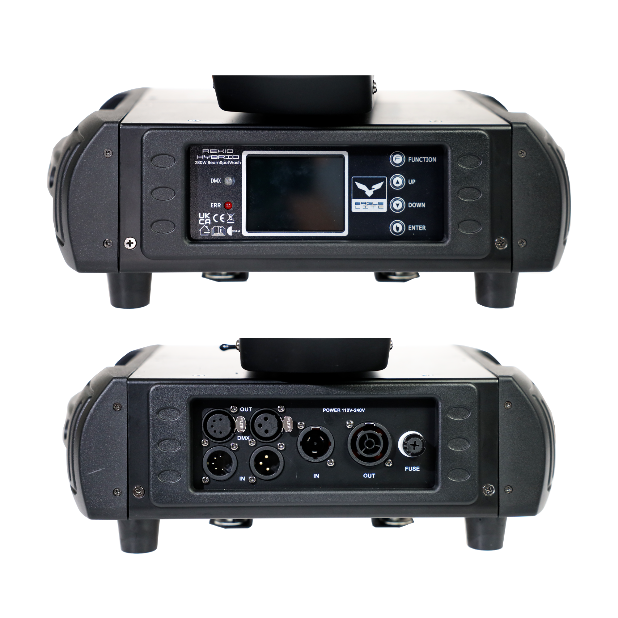 Vi har sørget for at lampen er nem at håndtere med en enkel touchskærm, hvor du kan finde rundt i de forskellige modes og indstillinger. REX10 HYBRID kommer med dmx modes i 16 eller 24 kanals mode, med forskellige makroer.